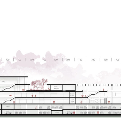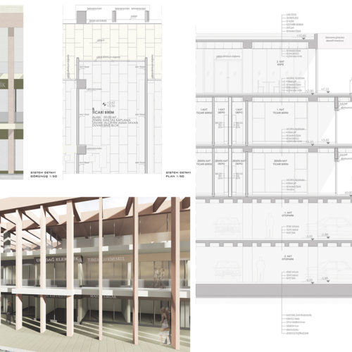 Ticari birimler modüler bir forma sahip olması ve ihtiyaç halinde birimlerde değişiklik yapılabilme olanağını sağlanmıştır. Mekanın organizasyonu sosyo-kültürel yaşantıyı, kentsel fiziksel çevre kurgusu içerisinde düzenlenmiştir. Dış mekânlar, bu mekânlardaki yaşantı ve aktiviteler ile sürdürmektedir. Bu doğrultuda yapının ele alınış biçimi bina tasarlamaktan önce kamusal boşluğu tasarlamak olmuştur.