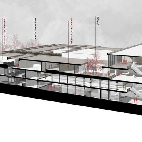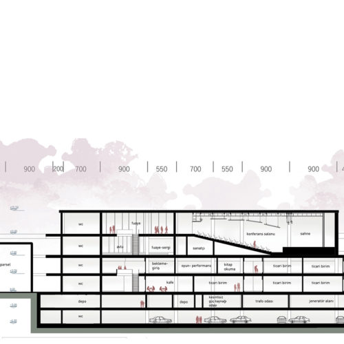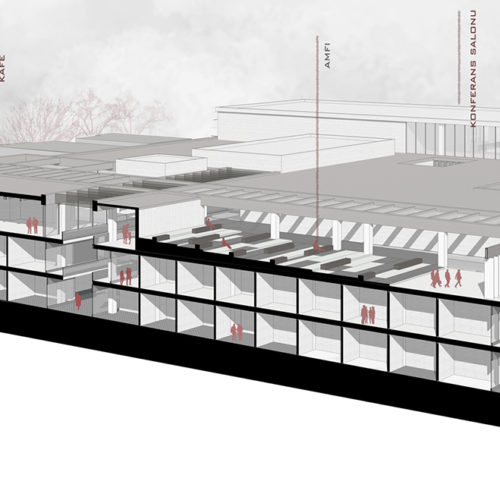 Çevredeki sokak dokusu, yapı dilini oluşturan ana etmen olmuştur. Çevreyle uyumlu, sirkülasyon alanı fazla olan yapı kütlesi ve oluşturulan galerileriler her kat kendi içinde iç-dış mekanları geçirgen ve bütüncül kat olarak tasarlanmıştır. Sokak dokusu oluşturmayı amaçladığımız bu sirkülasyon alanları, kullanıcıların nefes alıp dinlenebileceği yarı açık alanlar olup bu alanların güneşten daha fazla yararlanabilmeleri ve hava sirkülasyonun sağlanabilmesi için çatı kısmına kontrol edilebilir hareketli cam paneller tasarlanmıştır.