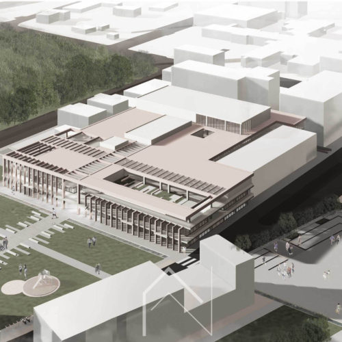 Çağdaş, kent estetiğine uygun ve yakın çevresi ile bütünlük kurması hedeflenen bir tasarım öngörülmüştür. Kentle olan ilişkisi, ulaşım ve yeşil alan müdahaleleriyle kuvvetlendirilip reaktif alanlar artırılarak bu odağın kentte bir çekim merkezi olması hedeflenmiştir. Yapının ön cephesinde konumlanan meydan, alana yaya ulaşımını teşvik edecek şekilde, yavaşlatılmış trafiğe sahip olan, yeşil yoğunluğunun fazla olduğu alan olarak, çevresindeki kentsel öğeleri birbirine bağlayan ve tüm öğelerin ortak toplanma noktası özelliğinde bir sosyo-kültürel meydan olarak tasarlanmıştır.